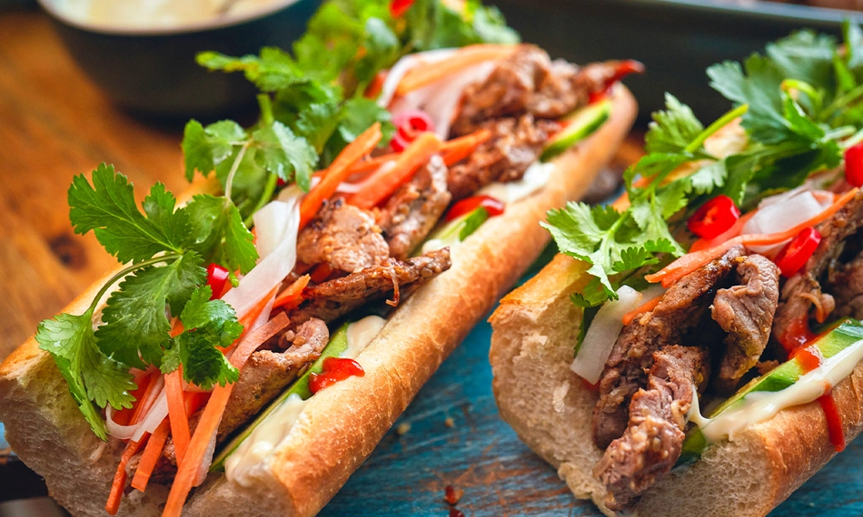 Genieße ein leckeres Banh Mi mit einem Getränk nach Wahl bei Banh Mi beej Wim: Köstliche vietnamesische Brötchen voller Geschmack zum Mitnehmen oder vor Ort essen