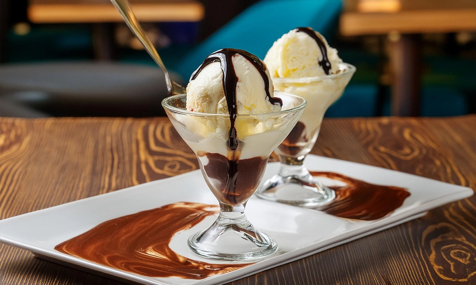 vanille-ijs met chocoladesaus en slagroom