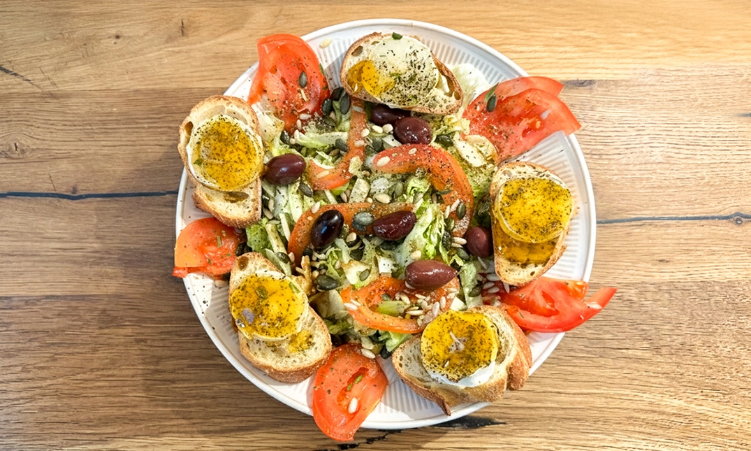 warme Franse geitenkaas op gegrilde sneetjes baguette met honing, geserveerd op verse sla met Griekse olijven en een noten- en zadenmix