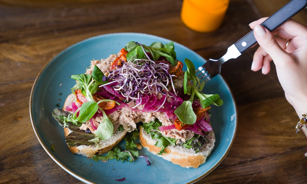 met zuurdesem, gegaarde rosbief, tonijnmousse, gekarameliseerde rode ui, zongedroogde tomaat, rucola en pitten - Geitenkaas