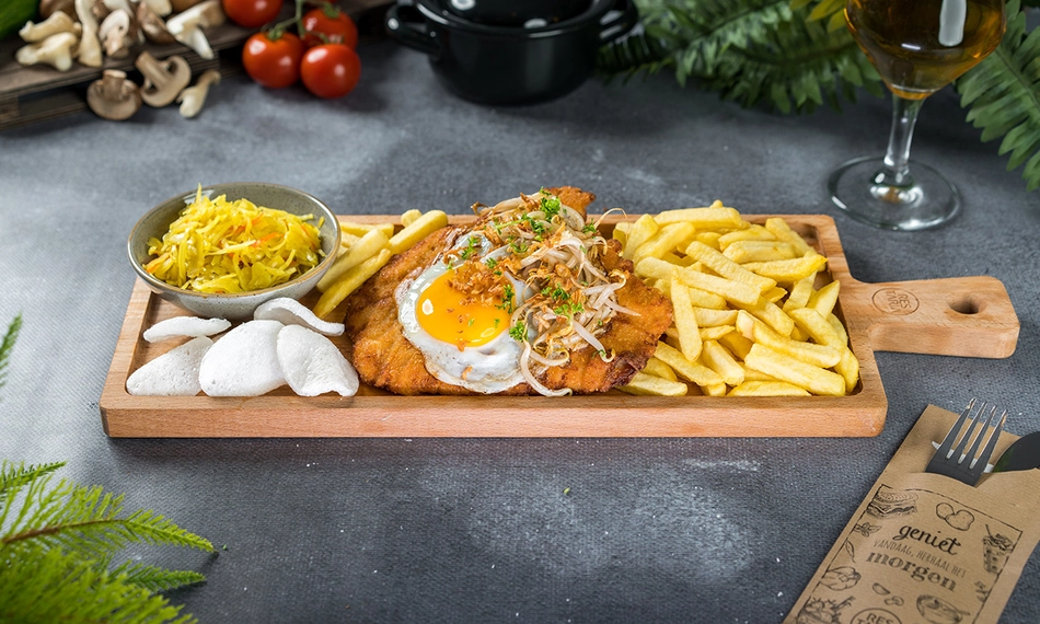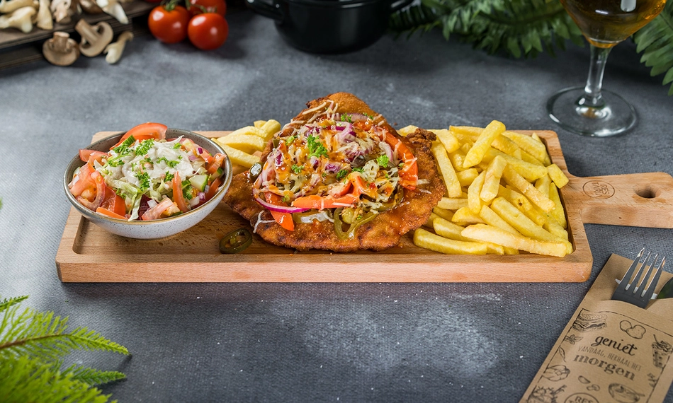Laat je compleet verwennen bij restaurant Hof van Brabant in Eindhoven. Hier kun je optimaal genieten van de gezellige ambiance, de spontane bediening en natuurlijk heerlijk eten. Maar liefst 3 gangen lang beleef jij een culinair avontuur. Bij het hoofdgerecht geniet jij van een overheerlijke loaded schnitzel naar keuze: smul bijvoorbeeld van de kruidige Indian, authentieke Italian of malse Pulled Pork. Perfect voor een avond uit met je partner, vrienden of familie. Eet smakelijk!
