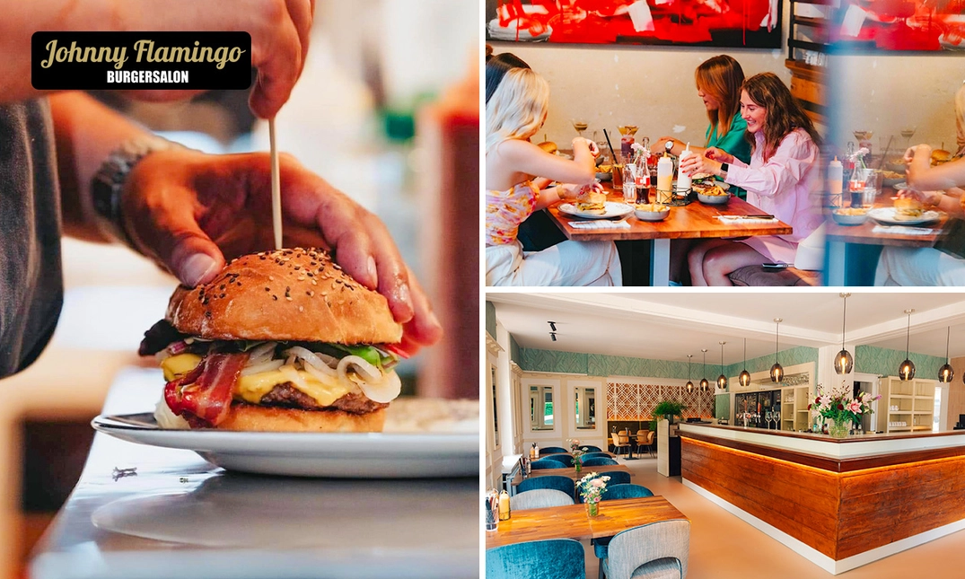 Geniet van een smakelijk 2- of 3-gangendiner à la carte bij Johnny Flamingo Schilde: smul bijvoorbeeld van de sappige hamburgers