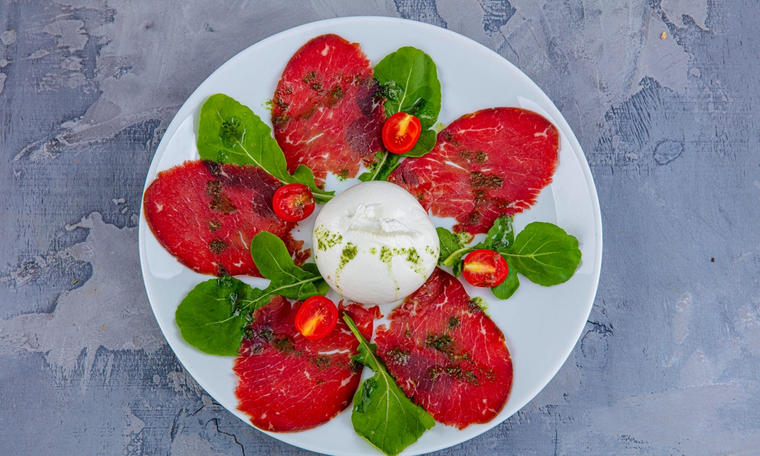 carpaccio de boeuf Black Angus accompagné d'une burrata des pouilles, mélange de salade gourmand