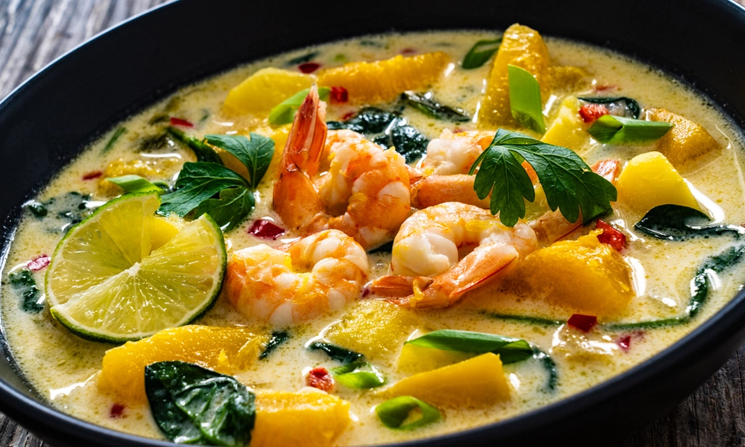 typisch gerecht uit Madras met ananas, limoen, kokosmelk, koriander en madrascurry (medium pikant) - Duck Mango Curry