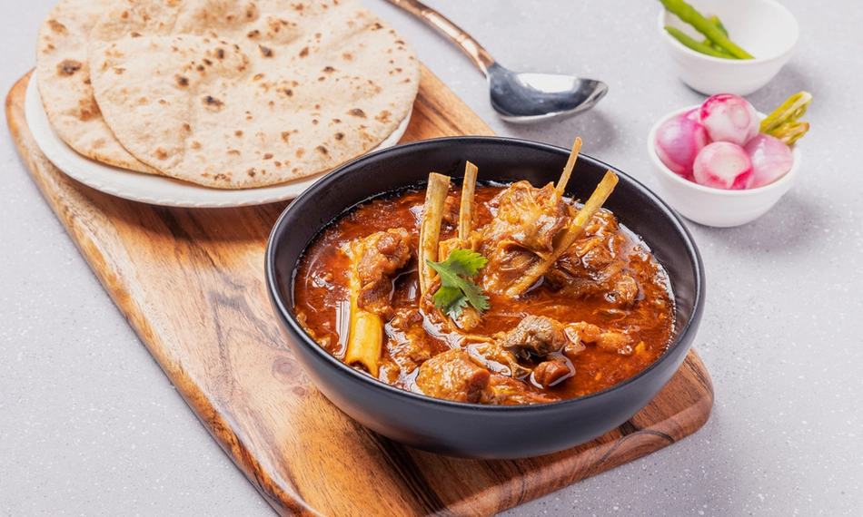 vlees gebakken in een tandoori-oven en geserveerd in yoghurtsaus met cashewnoten, room en methibaadjes - Vindaloo