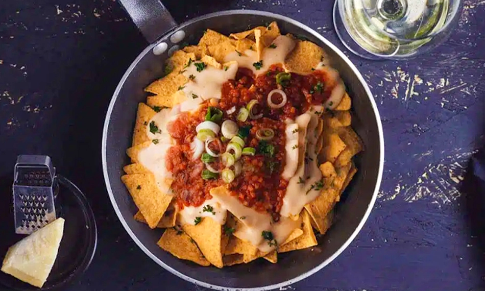 tortillachips overgoten met (veggie) bolognesesaus en kaassaus, je krijgt een gedeelde grote portie bij meerdere personen