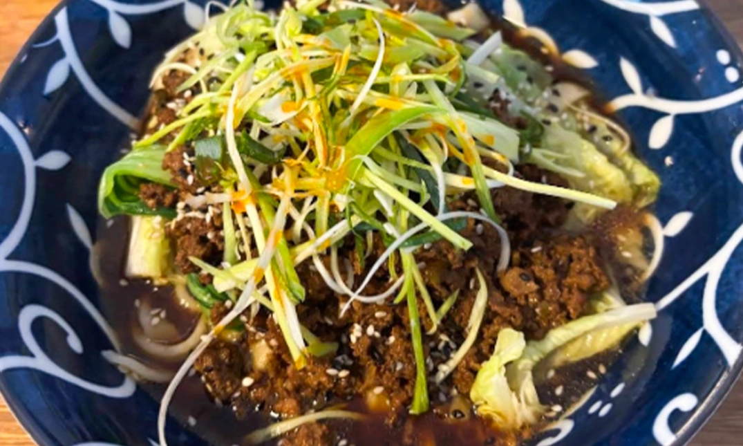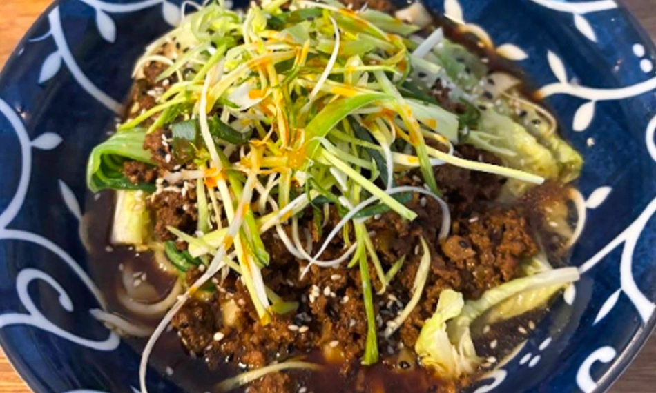 handgemachte Nudeln in einer cremigen Hafermilch-Suppe mit fermentierter Sichuan-Chili-Bohnenpaste, Tofu, Shiitake, Chinakohl, Bok Choy und Enoki, verfeinert mit Lauch und Sesam