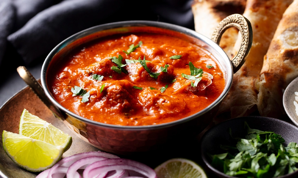 lamsvlees bereid in een currysaus met tomaten, boter en amandelen