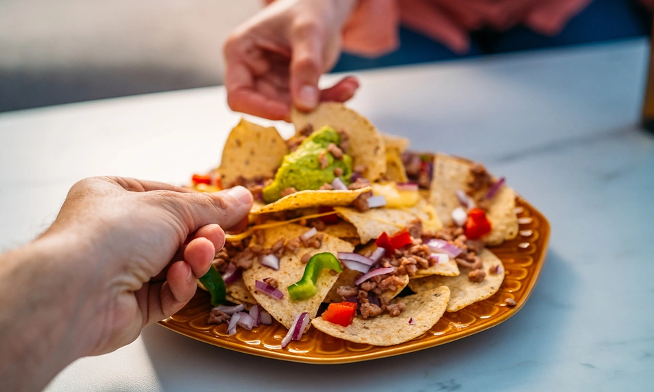gegrilde varkenshaas, geserveerd met huisgemaakte mais-chilisaus - Nachos
