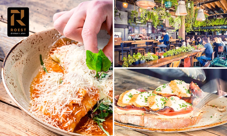 Neem plaats in het warme en industriële decor van Roest. Of kies bij mooi weer voor een plekje op het terras, vlakbij het water. Op de kaart staan smakelijke lunchgerechten, terwijl je tijdens het diner naast salades, pasta's, wraps en burgers geniet van homemade signature dishes. Een goede start van de dag pak je mee tijdens een stevig en heerlijk ontbijt. Alle ingrediënten voor een gezellige ochtend, middag of avond!