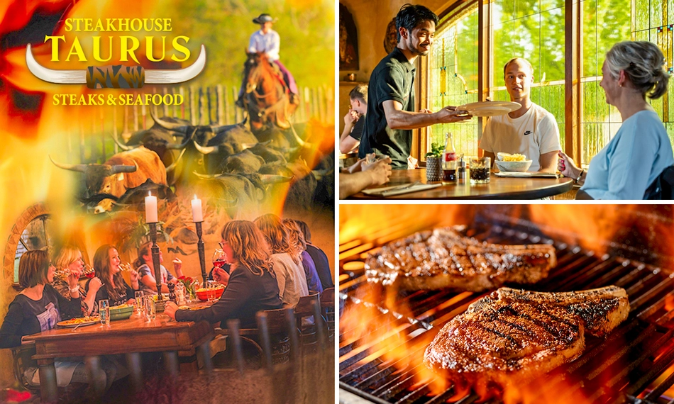 Bij Taurus World of Adventure kun je niet alleen de meest spectaculaire spellen spelen, maar ook heerlijk eten. Neem plaats in het prachtige Steakhouse Taurus en geniet van een uitgebreid 3-gangen keuzediner vol mediterrane en Argentijnse specialiteiten. Het rundvlees komt rechtstreeks uit Argentinië en wordt met passie voor je bereid. Liever vis of een vegetarisch gerecht? Ook dat is mogelijk! Ideaal om een dag vol spanning en sensatie af te sluiten. Wij wensen je alvast smakelijk eten!